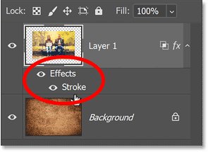 На панели «Слои» мы видим обводку, указанную как эффект под слоем.