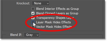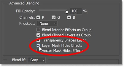 Откроется диалоговое окно «Layer Style», в котором установлены параметры наложения. В разделе Advanced Blending найдите параметр с надписью Layer Mask Hides Effects и просто включите его.