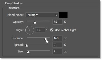 В параметрах Drop Shadow я установлю Angle на 135 градусов и Distance на 160 пикселей, что должно облегчить видимость тени. Остальные настройки по умолчанию.