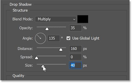 Я снова установлю Angle на 135 градусов и Distance на 160 пикселей. Но я также смягчу края теней, увеличив размер примерно до 40 пикселей. Затем я нажму «ОК», чтобы закрыть диалоговое окно «Layer Style».